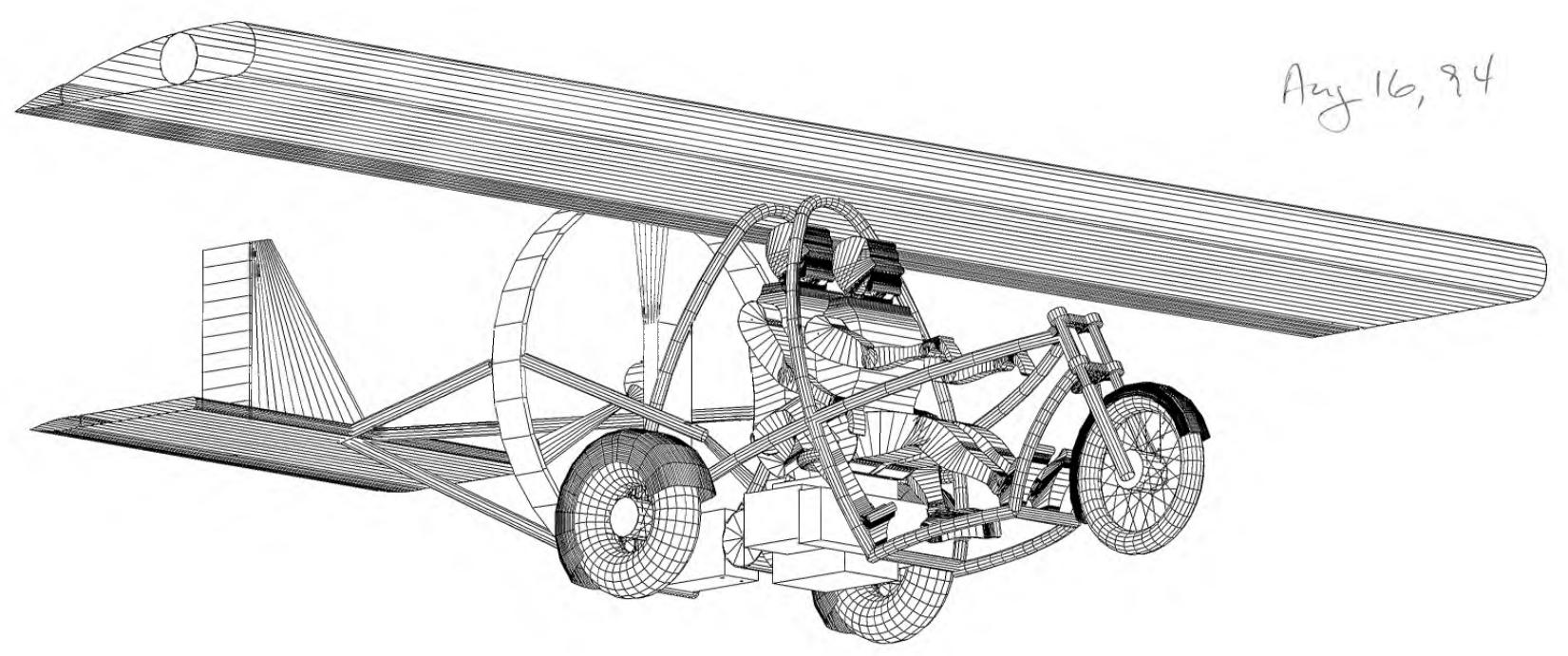 ![]() . In February 1992 I used a 2D print of two human profiles to establish the overall size. I have put in a proper roll cage. There is a windshield, as evidenced by the "wiper" call-out in the dash area. It also looks to have provisions for air conditioning from the little side-sketch. This version is a mid-wing with a conventional pusher propeller as opposed to ducted fans. The V-twin engine has given way to a Volkswagen Beetle power-train for the rear wheels. I think I planned on taking power from the tail housing of the VW transmission to drive a belt up to the propeller. ![]() A single-seat version with the VW drive-train. A fer lines with a ruler, sketches are one reason I was an early adopter of CAD. I first saw a pen plotter when I was an engineer at Ford motor in Dearborn. It was drawing an F-sized sheet metal drawing. The guy demonstrating it noted it used a 12-cent Bic pen. In 1987 I bought a PC to do schematics. |