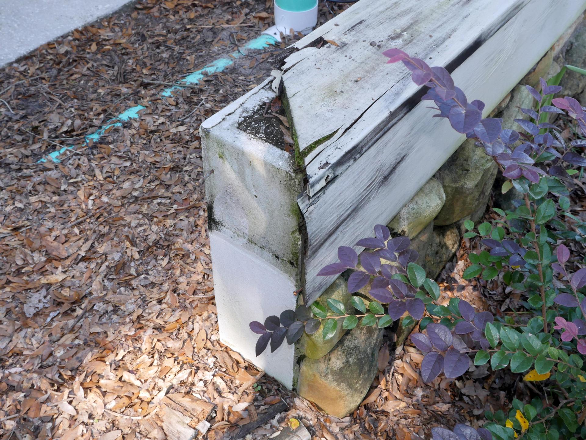 . OK, with this smaller wing wall installed, I still need to fill in the corner and paint it once more. The original walls cut a 45-degree at the top board so the end cap fit. Thing is, this cut was where the wet-rot was worst. I elected to keep the top board complete, and live with the little hole in the corner. I will fill it with putty. |