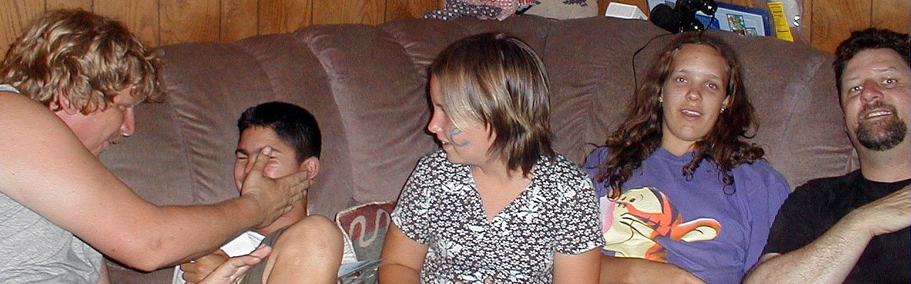 Charlie Jackson's son Charlie Jr. slapping Lee Webster's son Charles, Lori Kessenger's daughter Claire, Tracy, and Paul, all kicking back at the Ferguson house in Mountain View CA.