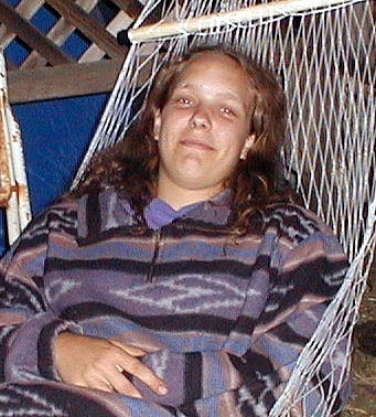 Tracy in repose on a hammock after a long day. At the house on Ferguson Drive in Mountain View CA. It's torn down now.