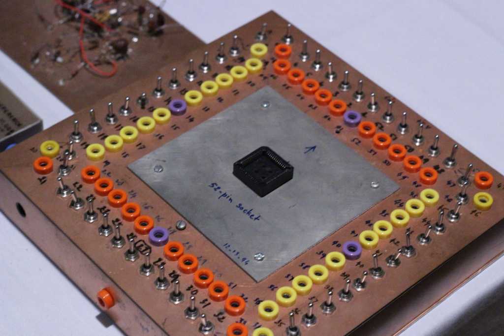 A breadboard from Bob Pease's home on top of Tom Frederiksen's Intuitive Op Amps book.