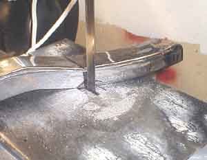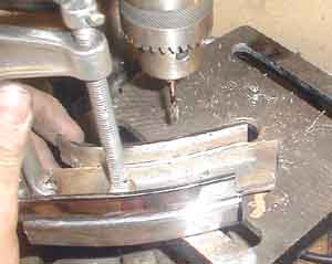 A lot more cogitatin' and measuring and I drill the hole to mount the front mount of the crash bars.  You can see the flanges on the left splayed out and ready to weld to the sporty strut.  The existing hole in the big bike strut was almost cut in half when we made the other piece that mounts the bags at the rear, but this partial hole lines up with the front mounting hole of the sportster strut.  Once again, the welds can break and the part will still be attached.
