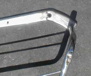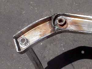 Here is the piece of big-bike strut welded to the Sporty strut.  You can see the hole is partially cut through but it is still better then nothing.  I considered welding a flat plate between the two mounting holes so the Sporty strut would press against the saddlebags the whole length of the mount but I figured it wasn't really necessary and would ugly-up the Sporty strut when you looked down on it in the installed position.  I figured better to take advantage of what little chrome was still shiny on the strut,