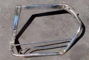 The final magilla with the crash bar mounted.  Another shot taken after the mounts were done so the little bracket to mount the bags at the bottom rear is already on.  Another look into the future.  Note also that I have flipped around the way the Sporty strut mounts to the bag.  At the beginning of this adventure I had the open part of the strut pressing up against the bag.  When I started cogitatin' on the front crashbar mount it became evident that it would be better to have to closed side of the flange mounted towards the bags so that the big-bike pieces would both be welded onto the Sporty strut in the same fashion.  It will look a little worse mounted on the bike because you will be able to see the open side of the rear big bike struts if you peer in between the bags way down low but it makes fabricating the mount a lot easier.  The swichero was easy-- what I had intended to be the right mount was now the left one and vice versa.  Then I welded on the little piece of the big bike strut in the front and the little bracket top mount the bags at the bottom rear and I was in business.