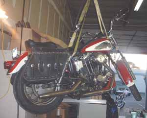 Do you wonder how I get the bike up on the old desks I use to work on?  A hoist on the roof beam.  The desks legs are dropped into big steel tubes I welded casters to.  I wheel the desk under the hoist, lift the bike and .....