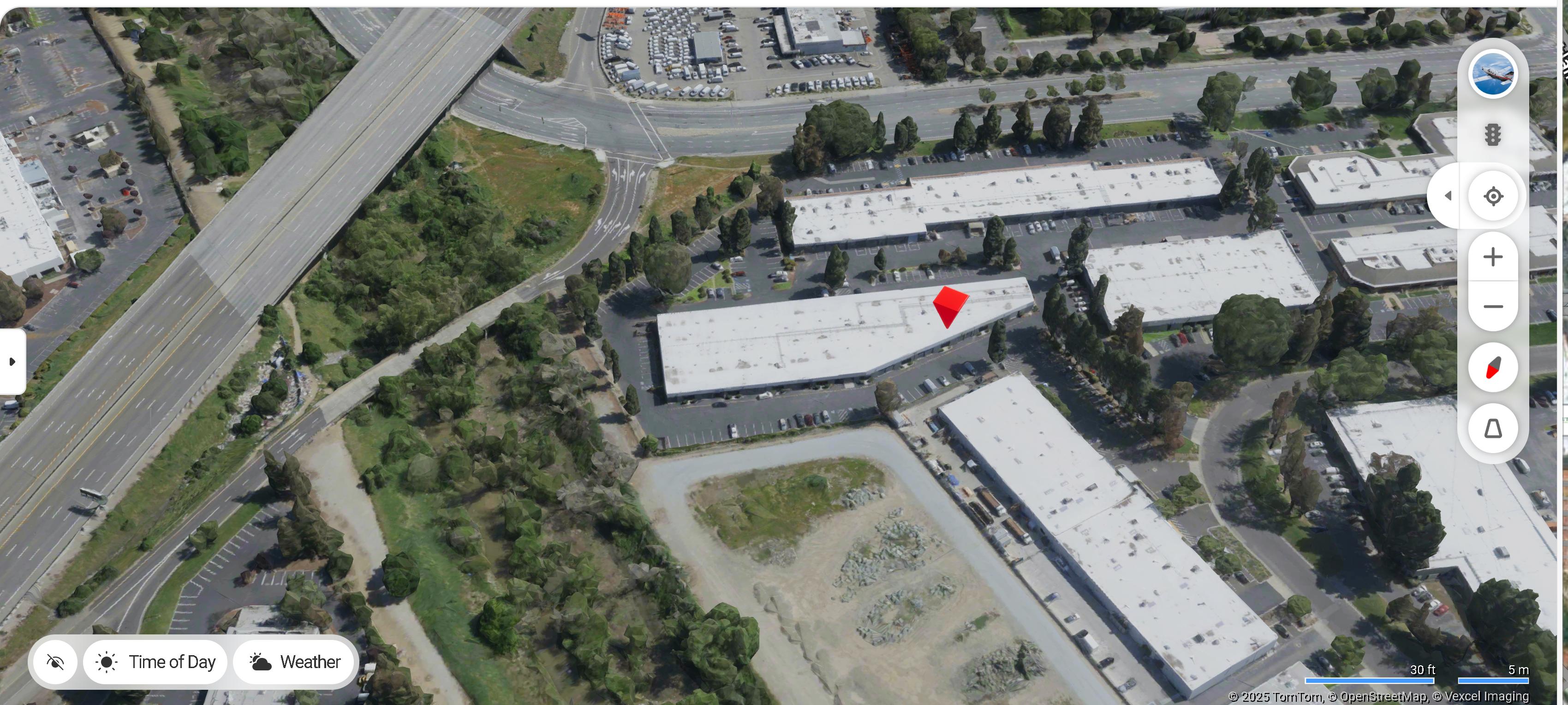 A satellite photo from 2000 shows Charlie's Ferguson house next to the last orchard in Mountain View California. A wide shot from 2000 shows how built-up Mountain View already was by then. And by 2025, the orchard and Charlie's rental house are long gone, it's all businesses now.